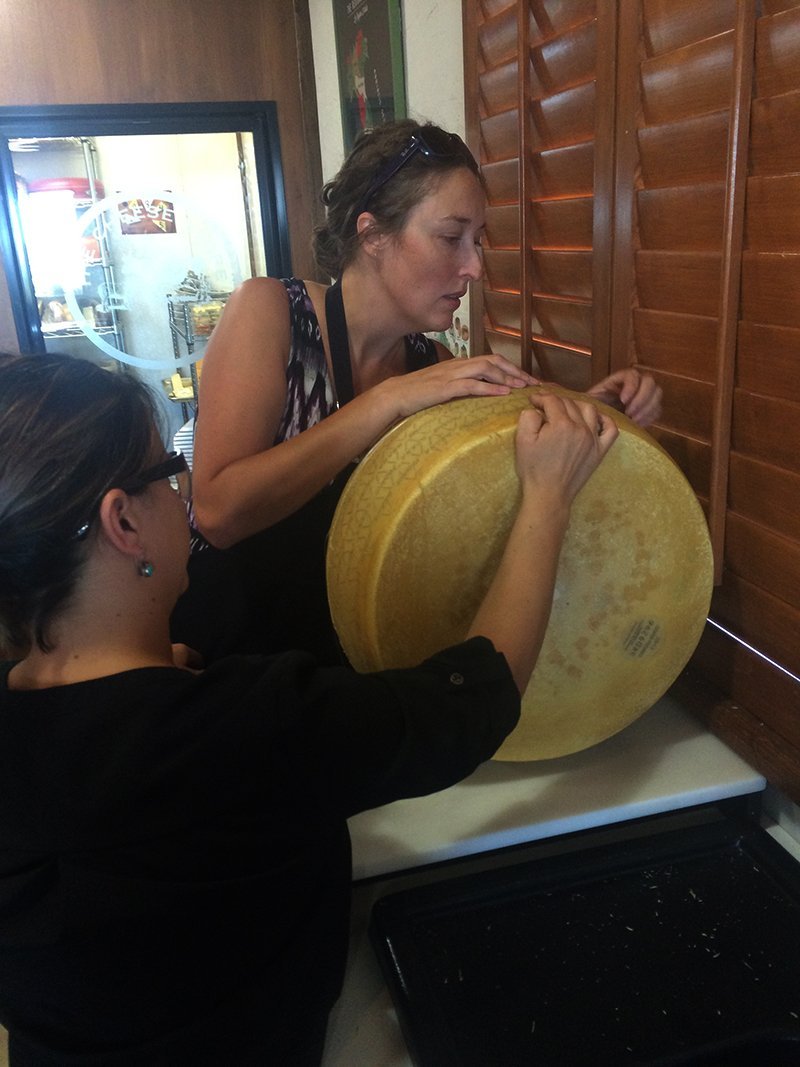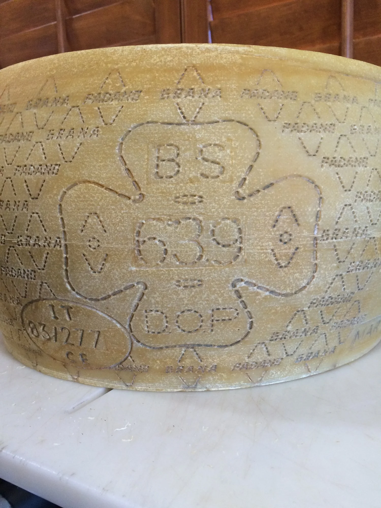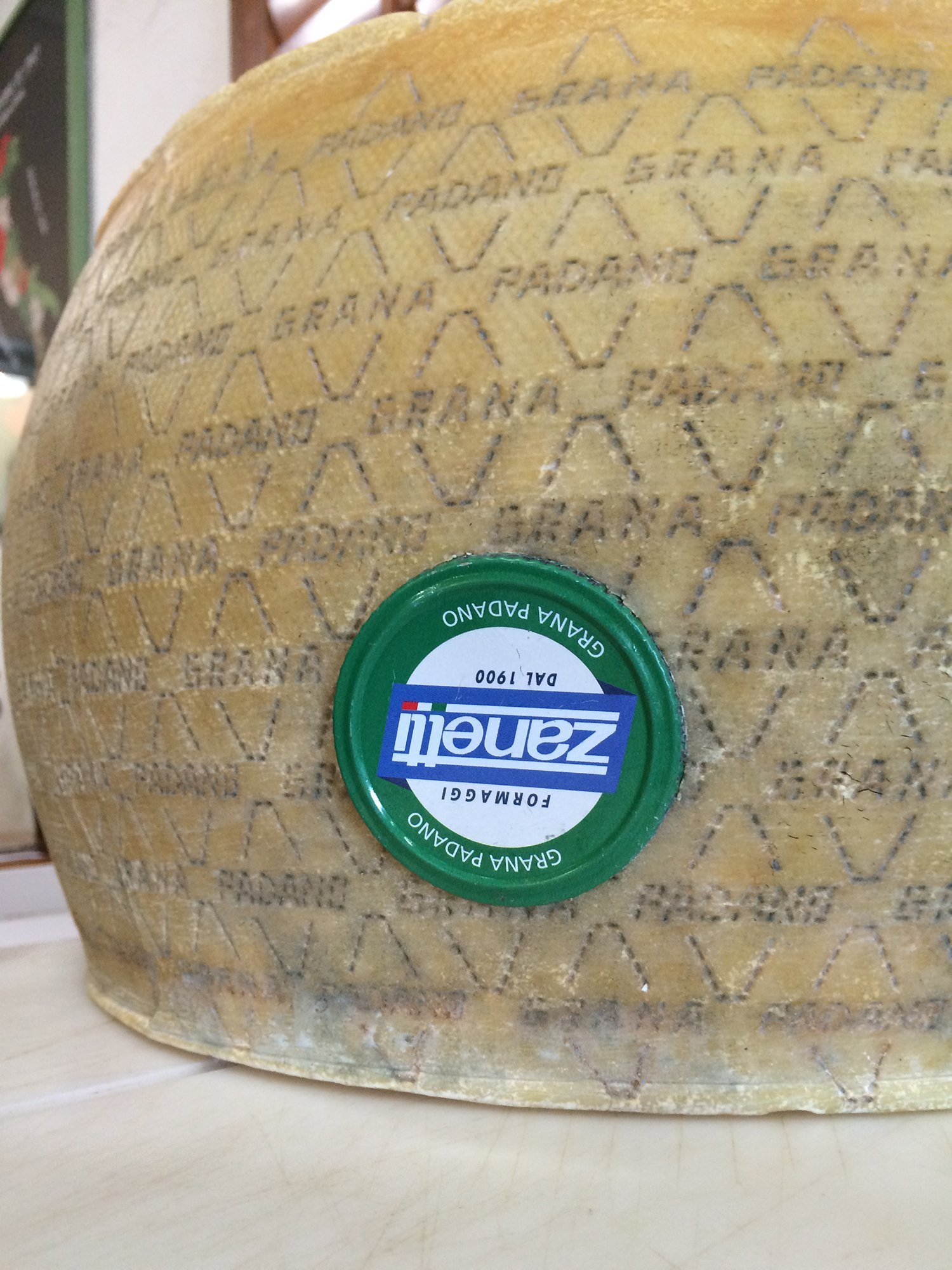 Wheels of Grana Padano range from about 70-88 pounds. This particular wheel is from Zanetti, a cheese company in Italy, and is marked with a metal seal to ensure the cheese’s authenticity.