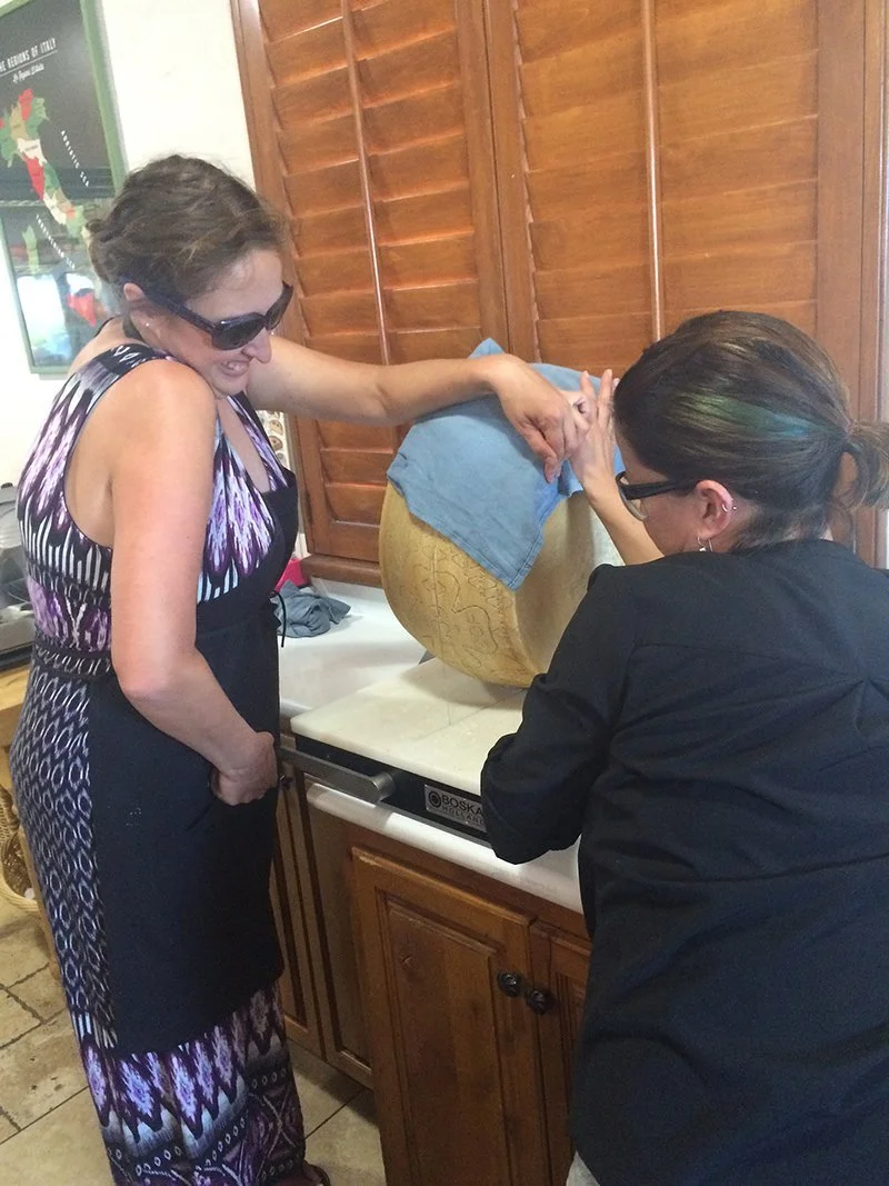 The wire was too small to fit around the cheese, and after some trial and error they were able to tie two wires together to accommodate for the size of the huge wheel. With great care (and some support from Cindi), Zina places the wire on the scored line and prepares to make the cut.