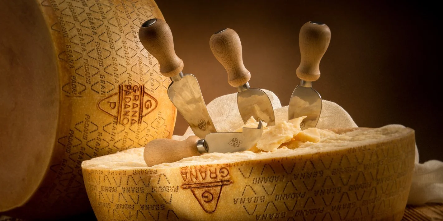 Typically, wheels of Grana Padano (and its cousin, Parmigiano-Reggiano) are cracked open using special knives inserted around the perimeter. Pressure builds until the wheel naturally fractures apart. It’s dramatic, authentic—and messy. The result is a beautiful, rustic crumble...but definitely not a clean line.